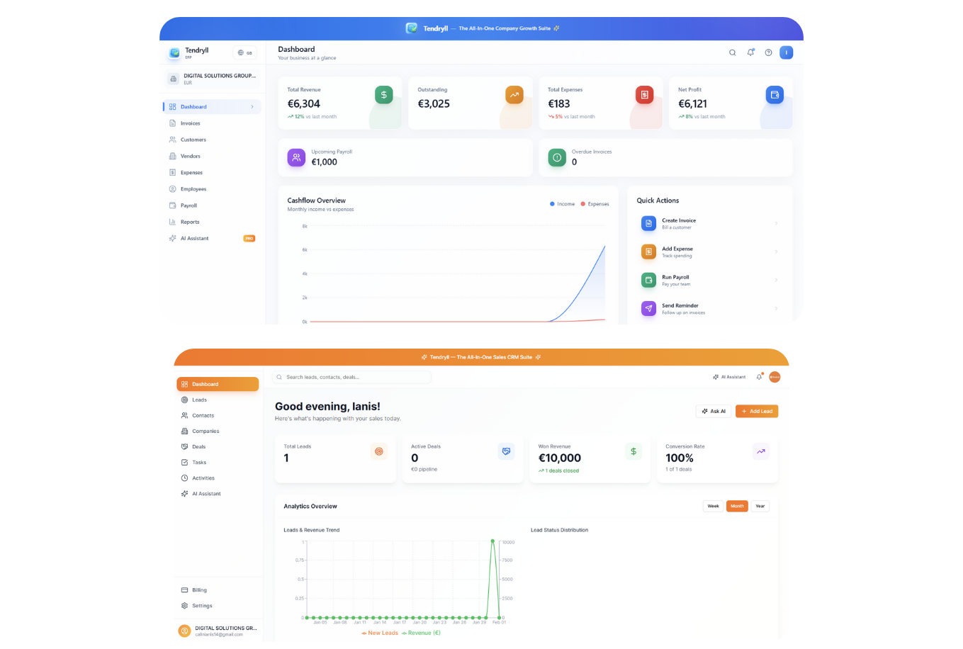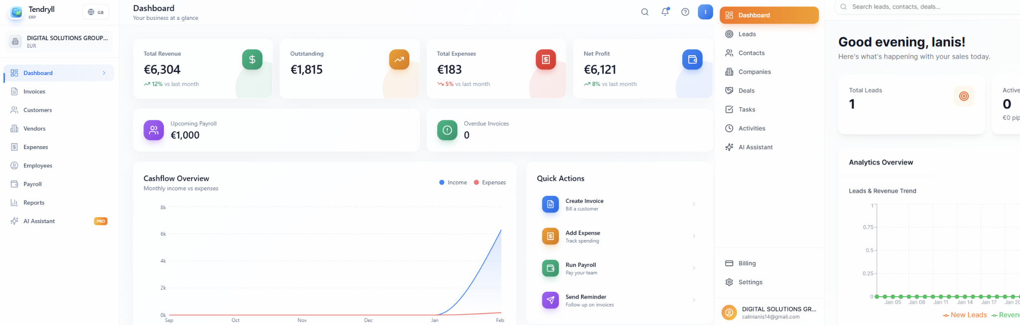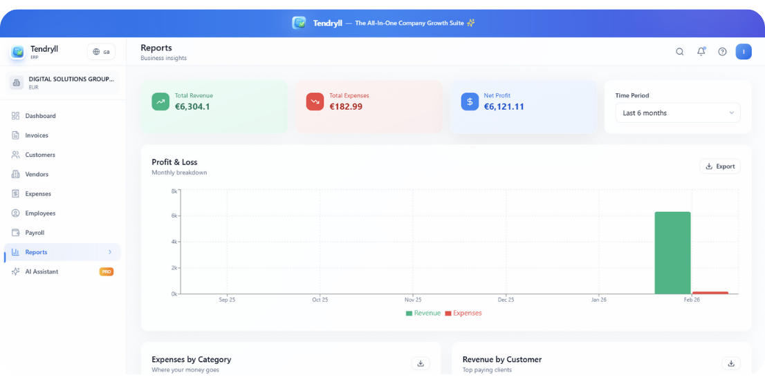 Tendryll ERP gives you full control over your finances — from invoices and expenses to profit, losses and cashflow. Built-in analytics and AI-powered insights help you understand your numbers and act faster, with confidence.