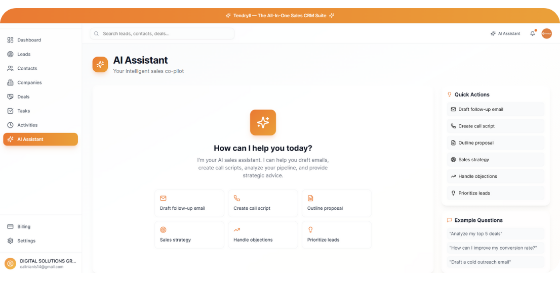Tendryll’s AI Assistant analyzes CRM activity, sales pipelines and customer interactions to suggest next actions. Know exactly what to do next — follow up leads, prioritize deals and optimize your sales strategy.